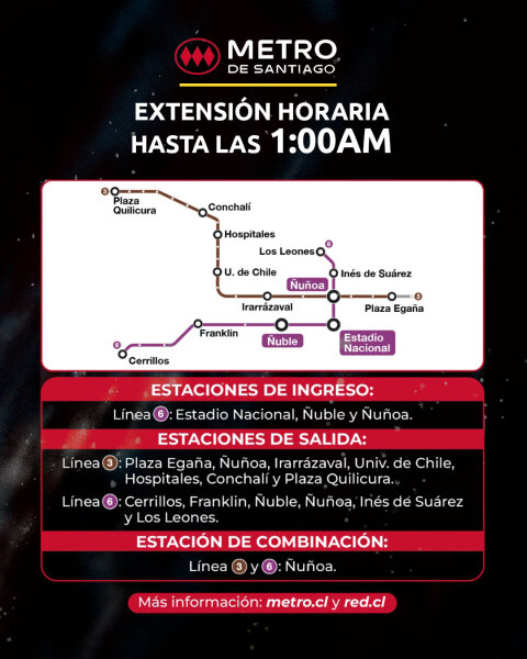 El Metro de Santiago extenderá su horario hasta la 1:00 de la madrugada, con ingreso habilitado en estaciones Estadio Nacional, Ñuble y Ñuñoa (Línea 6). En tanto, se podrá salir desde estaciones de Línea 6 y Línea 3, incluyendo Los Leones, Plaza Egaña, Irarrázaval, Universidad de Chile y Plaza Quilicura, entre otras.